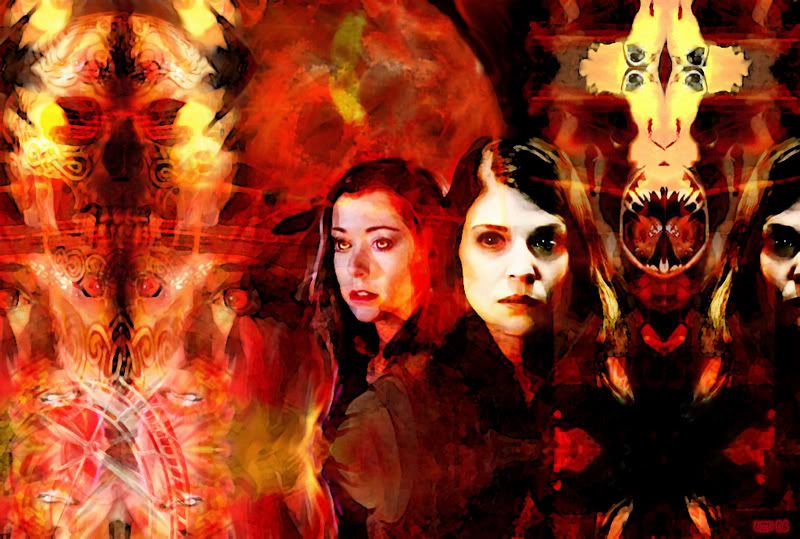 Since I'm a big horror fan, I'd like to kick off with a semi-horror theme. I've had the image of an Evil!Tara stuck in my head for absolute ages and thanks to a dark haired Amber Benson from Supernatural, I could finally make it a reality. I've paired her with an Evil!Willow natch and got some weird ink blot thingy going on as well. I wanted to create a kind of pattern affect to help balance the overall image. I'm not sure if I've succeeded but I'm pretty pleased with the result...